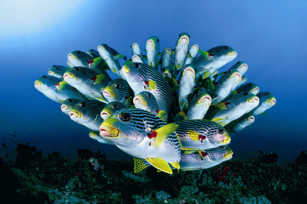 Die Diagonal-Süßlippen vor Papua-Neuguinea bilden im Schwarm immer neue Formationen.