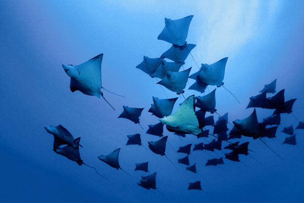 Die gefleckten Adlerrochen segeln zwischen den französisch-polynesischen Inseln elegant durchs Wasser.